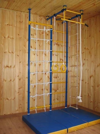 - спортивный комплекс представляет собой сборно-разборную конструкцию из металлических труб, закрепленных между потолком и полом в распор, на котором могут быть установлены до 8 спортивных снарядов.