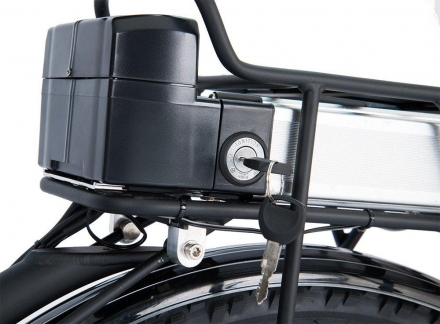 ✔ Электрооборудование велогибрида представлено достаточно мощным hub-мотором в ступице заднего колеса и съемной 36-вольтной литиевой батареей, установленной в стойке-багажнике позади удобного сиденья.